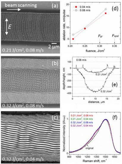 SEM images of microgrooves produced at low fluences (below the Fgr and Fspal thresholds) and two scanning velocities are shown in Figure 1, along with the ablation characteristics (Figure 1d,e) and Raman spectra (Figure 1f) of the grooves.