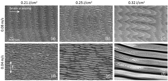 Changes in the groove morphology with increased fluence at the vs = 0.08 m/s, shown in Figure 1a,b, evidence an appearance of the relief periodicity, which is transformed to LIPSS (Figure 1c) at the lower velocity vs = 0.04 m/s and correspondingly larger pulse number. Details of the surface morphology in the central regions of the microgrooves fabricated at different fluences (0.21, 0.25, and 0.32 J/cm2) and two scanning velocities are presented in SEM images of higher magnification in Figure 2. These images confirm the formation of LIPSS at all the fluences and low scanning velocity vs = 0.04 m/s, attributing the surface relief changes at the higher velocity vs = 0.08 m/s (lower effective pulse number) to an initial stage of LIPSS formation.