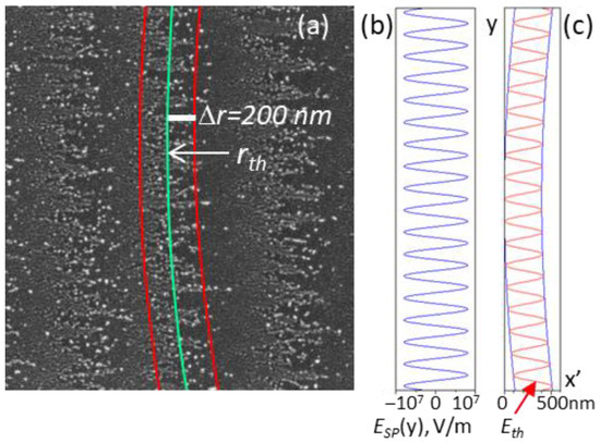 Taking the radius rth to define the ablation threshold of the groove surface, the threshold laser field in the absence of the SP is determined from Equation (1) as Eth = EL(rth) = E0 exp(−rth2/wo2). In the presence of the SP, the radius rth is the average value between two boundaries at the distances of rth ± Δr, as marked in Figure 4a by a green curve and two red curves, respectively. This is due to the interference of the laser field with the tangential (parallel to the surface) component of the electric field of the surface plasmon generated in the graphitized layer. Decomposing EL(r) into a Taylor series, we obtain the equation.