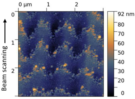 At the higher fluences, especially at F = 0.32 J/cm2, the values of Δr increase up to 600 nm, see Figure 2c. According to Equation (4), the SP field is estimated to be more than three times the above value of ESP,MAX = 1.3 × 107 V/m, as the Eth remains the same and the rth increases with fluence. It is seen in Figure 1b and Figure 2c that the amplitude of the equi-field sinusoid-like curves changes along the groove which could be dealt with a variable depth of a growing surface nanograting and enhancement of evanescent electric fields with the grating depth at the corrugated surface [33]. Most importantly, the location of the equi-field ‘nanoparticle’ curves on the emerging surface grating of 10–15 nm depth, shown in an AFM image in Figure 5, proves that the larger local electric fields are in the valleys and the weaker fields are at the ridges of the growing LIPSS. In addition, the observed fluence-dependent transformation of the convex ‘averaged Eth’ curves (related to the back edges of the laser spot, in Figure 1a) to the slightly concave ones (in the central area of the groove, in Figure 1b) is very unusual and not understood. It may be due to the surface relief of the microgroove changing with fluence (Figure 1e) when the effects of the groove slope on the local electric fields should be considered in further analysis and checked in experiments. More particular experimental data on the ablation mechanism and formation of nanoparticles during the sub-threshold processing with IR fs-laser are also required for a better understanding of the LIPSS growth on the DLN surface in dependence on the irradiation conditions.