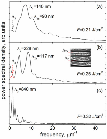 1D-FFT spectra (a–c) characterizing the periodical nanorelief in the direction perpendicular to the ripples of the SEM images shown in Figure 2d–f; the Λ3 peak (marked in red) in (b) is a result of the FFT spectrum decomposition in the frequency range of 0–2 μm−1; an inset in (b) illustrates that the appearance of the Λ2s peak is due to high-brightness edges of thin layers formed by spallation.