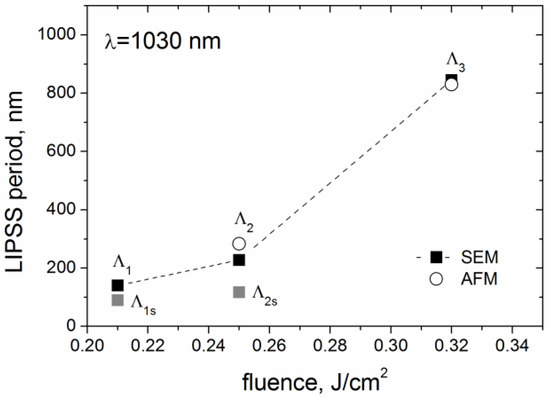 An interesting feature of the obtained 1D-FFT spectra is related to the appearance of a second peak of higher frequency (smaller period) in the FFT spectra of the SEM images of the groove surface processed at two low fluences, especially in the spectrum shown in Figure 6b. The higher-frequency peak, marked as Λ2s in Figure 6b (and Λ1s in Figure 6a), is due to high-brightness edges of thin layers originating from laser-induced spallation on the tops of hill-like regions of the forming surface grating. This makes the Λ2s (and Λ1s) peak not relevant to the true period of the formed LIPSS, as it is defined principally by the yield of secondary electrons but not the surface grating parameters. The data of the FFT analysis of the periodical surface nanostructures formed on the DLN film in sub-threshold fs-laser processing are summarized as the LIPSS period-on-fluence dependence in Figure 7.