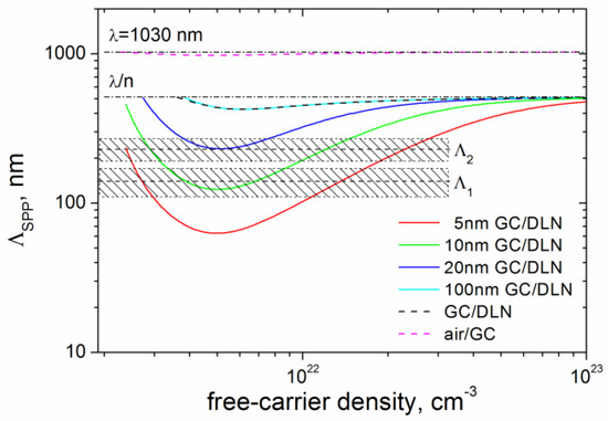 Period of SPP modes vs. free-carrier density, calculated using Equation (6) for different thicknesses of the laser-excited GC layer (5, 10, 20, and 100 nm); for comparison, the ΛSPP data calculated for the interfaces air/GC and GC/DLN using Equation (7) are shown by dashed lines; the Λ1 (140 ± 30 nm) and Λ2 (230 ± 40 nm) regions mark the experimental periods of LIPSS from Figure 6 and Figure 7; dash-dot lines mark the light wavelengths in air and DLN film (n = 2).