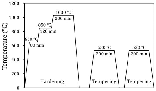 The punch for forming the steel sheet during the wear test was composed of STD-11 tool steel (KS D 3753) manufactured by POSCO Pohang Steelworks. STD-11 tool steel is generally used for materials of stamping tools in the automotive industry and is comparable to SKD-11 (JIS G 4404), D2 (ASTM A 681-08), and 1.2379/X153CrMo12 (DIN EN ISO 4957). The mechanical properties of D2 tool steel are summarized in Table 2 [39]. In order to harden the STD-11 tool steel by introducing a martensite microstructure, heat treatment was performed as shown in Figure 1. The STD-11 tool steel was hardened in avvacuum at 650, 850, and 1030 °C for 80, 120, and 200 min, respectively, and then air-cooled. A two-step tempering was performed at 530 °C for 200 min to reduce brittleness caused by quenching. The Vickers hardness at a 0.1 kgf normal load of the STD-11 tool steel was 788.5 ± 12.2 HV0.1, which was referred to in previous literature [35]. The chemical compositions of TRIP1180 steel and STD-11 tool steel are listed in Table 3.