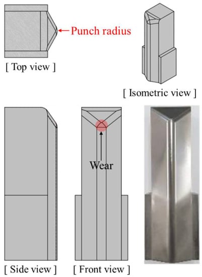 In automotive sheet metal forming, tool wear generally occurs in the sharp-curvature area of tools subjected to localized contact pressure. The tool used for the wear test imitated the sharp-curvature geometry prevalent in automotive sheet metal forming. A smaller curvature radius of the forming tool causes a higher contact pressure to be localized on the tool surface. Thus, to evaluate the sensitivity of wear rate according to the tool shapes, a punch with a radius of 3.0 mm and 5.5 mm was introduced for the wear test and the wear of both punches was designed to be localized in the curvature regions. The punch geometry is presented in Figure 2. Dimensions of both punch shapes are previously reported in detail in the literature [35]. Die-to-punch gap was defined as 1.32 mm to avoid ironing, which is 10% clearance. Furthermore, they were designed as insert-type punches to efficiently inspect and interchange worn-out punches. The punch stroke for one stroke was 35.0 mm. The geometrical parameters for the stamping process were the same as in a previous report.