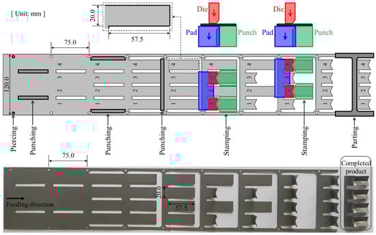 In general, when forming UHSS, several thousand to tens of thousands of strokes are required to examine the wear characteristics of coated tools. Thus, in the present study, progressive die tools are suitable for continuous wear tests. A press system, uncoiler, and automatic feeding system were used for the fast, convenient, and systematic wear test. Because a rolled-steel coil was directly used without any production of the specimen, it was more economical and efficient. The layout for the various metalworking operations of the employed progressive die tool is shown in Figure 3. The progressive die tool was designed to test the four types of punches simultaneously, thereby reducing the time and cost required for the wear tests. Metalworking operations involve techniques such as piercing, punching, stamping, and parting. The piercing process creates holes in the sheet metal by using a shearing tool. These holes allow the sheet metal to move into a progressive die set in sections of 75.0 mm during metalworking operations. The punching process entails the creation of a blank shape by using a shearing tool. The continuous stamping process causes wear on the punch surface due to the contact between the punch and blank. The blank created through the punching process was 20.0 mm and 57.5 mm in width and length, respectively. The press rate was 15 strokes per minute. In the parting process, the formed products are cut from sheet metal by using a shearing tool. A detailed description for each metalworking operation and testing setup has been reported in a previous paper [35] that proposed the test method of tool wear in sheet metal stamping.