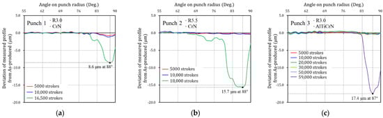 Evolutionary behavior of wear depth on the punch radius with respect to the number of strokes: (a) Punch 1 (PVD CrN-coated punch with a radius of 3.0 mm), (b) Punch 2 (PVD CrN-coated punch with a radius of 5.5 mm), and (c) Punch 3 (PVD AlTiCrN-coated punch with a radius of 3.0 mm).