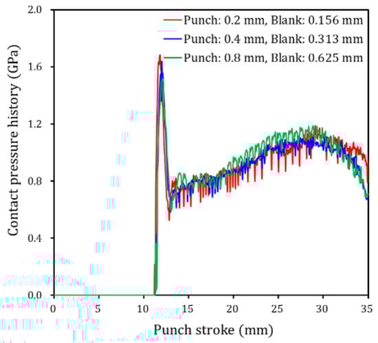 Figure 6 compares the contact pressure history at a node on the punch radius where the highest contact pressure occurs to evaluate contact characteristics according to mesh sizes and predicted contact pressures for all mesh size cases are of similar magnitude. The simulation was performed on a computer with an Intel Core i7-6700 CPU and 8 GB RAM. Computational time was approximately 8 h, 2 h, and 20 min, respectively, as summarized in Table 5. Thus, a mesh size of 0.8 mm at the punch contact interface can effectively reduce computational time. However, as shown in Figure 5, if the mesh size at the contact interface is coarse, the number of elements between 55 and 90° on the punch radius is insufficient such that it is difficult to accurately analyze contact characteristics over the punch radius. Therefore, in the simulation cases for this study, a 0.2 mm mesh size was applied at the punch contact interface, and 0.156 mm was used for the final blank mesh size by applying six levels of the mesh refinement method, which is sufficiently refined for accurate prediction of the contact conditions on the punch surface.