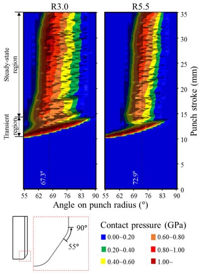 In sheet metal forming, the contact pressure and sliding distance are the most significant factors influencing tool wear [24,46,47,48,49]. Thus, these two factors on the punch radius were investigated. To understand the time-dependent evolution of contact pressure along the punch radius during the stamping process, Figure 7 shows contour plots of the contact pressure over the punch radius during stamping. The ordinate represents the punch stroke level during stamping, while the abscissa represents the angle on the punch radius. As shown in Figure 7, the contact pressure levels over the radius of the R3.0 punch were higher than that over the radius of the R5.5 punch. Figure 8a plots the maximum contact pressure with respect to the punch stroke level for each punch shape. A highly localized contact pressure was distributed on both punch shapes between approximately 10.0 mm and 13.0 mm of the punch stroke. In this punch stroke range, the maximum contact pressures acting on the R3.0 and R5.5 punches were 1.707 GPa and 1.372 GPa, respectively. These maximum contact pressures moved along the punch radius transiently from 55.0° to approximately 83.0° for both the R3.0 and R5.5 punches, as shown in Figure 8b, which plots the angular location of the maximum contact pressure as the punch stroke progresses. A relatively high contact pressure was experienced over most of the angular range of the punch radius during the short punch strokes. Pereira [24] defined the initial region of the stamping process as a transient region where the angular location and magnitude of the contact pressure on the punch radius change significantly; this region is between approximately 10.0 and 13.0 mm of the punch stroke in the present study. In this transient region, a blank was formed and wrapped over the punch radius such that a transient change in the contact pressure response occured with the changes in the contact conditions of the punch radius. As shown in Figure 7, a steady and relatively lower contact pressure than that of the transient region was distributed over the punch radius for both the R3.0 and R5.5 punches between approximately 13.0 mm and 35.0 mm of the punch stroke. Pereira [24] referred to the region with such a steady contact pressure response as the steady-state region. Figure 8a illustrates the magnitude of the maximum contact pressure in this punch stroke range in more detail. A relatively steady contact pressure was observed for both punches. In addition, the contact pressure of the R3.0 punch was approximately 0.15 GPa higher than that of the R5.5 punch. In the steady-state region, the relatively high contact pressure for each punch stroke was concentrated at approximately 67.3° and 72.9° on the punch radius for the R3.0 and R5.5 punches, respectively, as shown in Figure 8b. Although the geometrical wrapping angle of the blank was 90° for both punches, the contact angle on the punch radius of the R5.5 punch was larger. The difference in contact angle on the punch radius can be inferred from the geometrical difference between the R3.0 and R5.5 punches. Bang et al. [18] revealed that the wear of a coated tool is caused by the interaction between the contact pressure and the sliding distance in the stamping process. Therefore, the transient region, where the highly localized contact pressure and short sliding distance occur, is not considered to have a critical effect on the wear response. Therefore, tool wear is expected to occur in the steady-state region. Figure 8c shows the contact conditions at approximately 67.3° and 72.9° on the punch radius for the R3.0 and R5.5 punches, respectively, where the highest contact pressure and longest sliding distance in the steady-state region occur. Because the curvature of the R3.0 punch was sharper than that of the R5.5 punch, the R3.0 punch has a higher contact pressure.