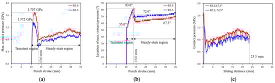 Contact conditions on the punch radius for the R3.0 and R5.5 punches: (a) maximum contact pressure with respect to the progression of the punch stroke, (b) location of the maximum contact pressure with respect to the progression of the punch stroke, and (c) contact conditions at approximately 67.3° and 72.9° on the punch radius for the R3.0 and R5.5 punches, respectively.