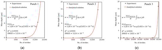 Definition of dimensionless wear coefficient of the analytical solution (Equation (4)) to accurately predict the evolutionary wear behavior of experimental wear data: (a) Punch 1 with a radius of 3.0 mm coated with PVD CrN, (b) Punch 2 with a radius of 5.5 mm coated with PVD CrN, and (c) Punch 3 with a radius of 3.0 mm coated with PVD AlTiCrN.