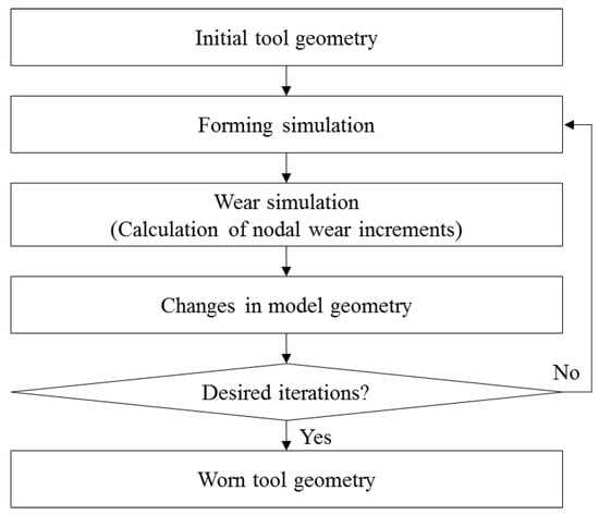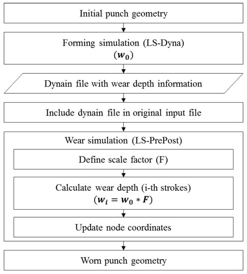 To reduce the time required for tool wear prediction in sheet metal forming, several numerical simulation studies have been conducted on tool wear prediction. Hoffmann et al. [36] proposed a wear simulation scheme using Archard’s wear equation to calculate the elemental wear, which is linearly proportional to the number of strokes. However, in sheet metal forming, the tool wear is nonlinear with respect to the number of strokes. Therefore, many efforts have been made to estimate the wear behavior of stamping tools reasonably and accurately. Ersoy-Nürnberg et al. [37] proposed a modified Archard’s model with a variable wear coefficient with respect to the loading duration. The wear coefficient is a function of the accumulated wear work and is determined through deep-drawing experiments. Wang et al. [38] approximated the changes in wear coefficient during testing by using pin-on-disk test results to reflect the variation of wear characteristics reasonably. The studies described above used a simulation scheme of updating the geometry based on changes to the geometry calculated from interactive iterations of forming and wear simulation. A wear simulation calculates elemental wear using contact-related information obtained from a forming simulation. The updated geometry from the wear simulation is used in the next forming simulation. These procedures are repeated until the desired iteration. Therefore, the conventional wear simulation scheme considering the geometry update requires substantial computational time to predict the wear of forming tools. In addition, because the studies described above evaluated only simple models, wear simulation for complex and large parts such as automobile components requires massive computational time. Therefore, it is necessary to establish a reasonable wear simulation process that takes less computational time and considers the nonlinear tool wear behavior in sheet metal forming.