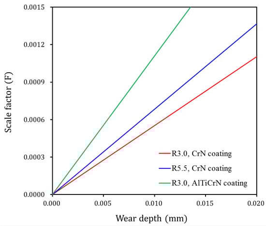 Figure 11 plots the scale factors for each stamping punch condition. The abscissa is the analytical solution for the wear depth calculated from Equation (4) for each stamping punch condition. The ordinate is the change in the dimensionless wear coefficient with respect to the change in the number of strokes . In the case of the CrN-coated punches, the (red line) of the R3.0 punch is smaller than that (blue line) of the R5.5 punch at the same wear depth value. That is, for punches with the same surface hardness, to calculate the same wear depth, is inversely proportional to the contact pressure and sliding distance, which can be calculated from Equation (4). Therefore, the scale factor of the R5.5 punch, which has a smaller contact pressure, is larger than that of the R3.0 punch. In the case of punches with the R3.0 punch shape, the (green line) of the AlTiCrN-coated punch is larger than the (red line) of the CrN-coated punch. For punches subjected to the same contact conditions, it can be confirmed from Equation (4) that is proportional to the surface hardness to calculate the same wear depth. This phenomenon is reflected in the simulation by inputting the wear depth versus scale factor into the “Wear analysis” application in the piecewise linear format. The wear depth from i-th strokes can be calculated by multiplying the scale factor by the wear depth from the forming simulation, and the amount and location of the punch wear can be visually confirmed in LS-PrePost. Therefore, this wear simulation method using the scale factor does not need to update the geometry and calculate the accumulated wear from the previous iteration of the wear simulation.