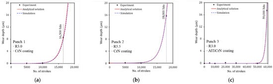 Comparison of the experimental results, analytical solution, and simulation results based on the revised Archard’s wear model with respect to the number of strokes: (a) Punch 1 with a radius of 3.0 mm coated with PVD CrN, (b) Punch 2 with a radius of 5.5 mm coated with PVD CrN, and (c) Punch 3 with a radius of 3.0 mm coated with PVD AlTiCrN.