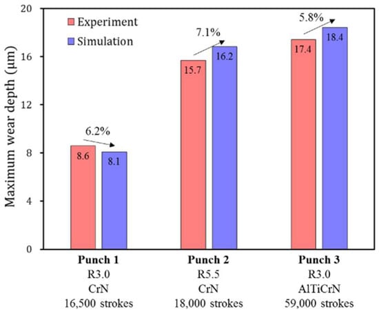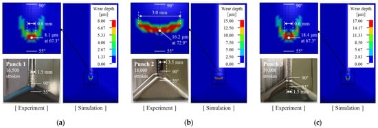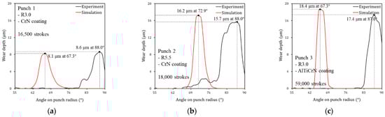 Wear depth on the punch radius obtained from experiments and simulations after the failure: (a) Punch 1 with a radius of 3.0 mm coated with PVD CrN, (b) Punch 2 with a radius of 5.5 mm coated with PVD CrN, and (c) Punch 3 with a radius of 3.0 mm coated with PVD AlTiCrN.