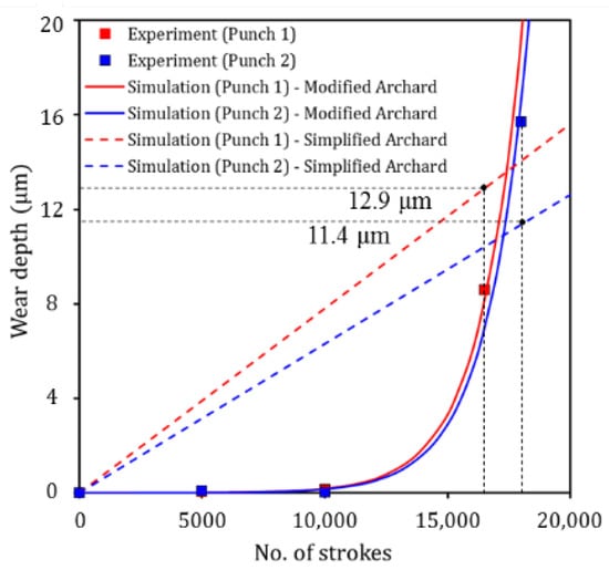 The simulation results based on Equation (8) were obtained for CrN-coated punches and compared with experimental and simulation results based on the modified Archard’s wear model, as shown in Figure 17. Punch 1 (CrN-coated punch with a radius of 3.0 mm) failed after 16,500 strokes and the wear depth measured was 8.6 μm. However, the predicted wear depth based on the simplified Archard’s wear model is 12.9 μm. For Punch 2 (CrN-coated punch with a radius of 5.5 mm), failure occurred after 18,000 strokes, and the wear depth measured was 17.4 μm. The predicted wear depth at 18,000 strokes based on the simplified Archard’s wear model was 11.4 μm. It can be observed that wear depth predicted by the simplified Archard’s wear model in terms of the number of strokes at which failure occurred, significantly differed from experimental results. In addition, the experimental and simulation results based on the modified Archard’s wear model demonstrated no wear at 5000 and 10,000 strokes (i.e., before failure). It was confirmed that the simplified Archard’s wear model has limitations in simulating nonlinear wear behavior of the tool in sheet metal forming.