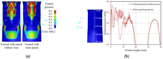 Contact pressure of the product formed with punch geometry without wear and worn punch geometry: (a) contour plot of contact pressure, (b) quantitative comparison of contact pressure.