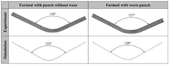 Tool wear during the press forming process leads to reduced product quality. From the results of the Punch 1 wear test, it was confirmed that although the wear depth was 8.6 μm, severe scratches occurred on the product surface. The contact pressures of the formed product were compared when formed with punch geometry without wear and with worn punch geometry. Figure 18a shows the contact pressure of the formed product before and after failure initiation. It can be observed that the contact pressure before failure is higher than that after failure in the middle region of the product in contact with the curvature region of the punch. Figure 18b plots the contact pressure in the middle region of the product (dotted line), which is in contact with the punch curvature region. The contact pressure of the product formed prior to the failure (red solid line) is higher than that post failure (red dash line) in a product length of approximately 3 to 10 mm. To confirm the effect of this minor wear depth on product deformation shapes, the effective plastic strain and stress of the formed products before and after failure was analyzed. The effective plastic strain and stress of the formed products were compared when formed with punch geometry without wear and with worn punch geometry. Figure 19a shows the effective plastic strain of the formed product before and after failure. It can be observed that the effective plastic strain prior to failure is higher than that after failure in the middle region of the product in contact with the curvature region of the punch. As shown in Figure 19b, the effective plastic stress before failure is also higher in the middle region of the product. To quantitatively compare product conditions before and after failure, Figure 19c plots the effective plastic strain and stress in the middle region of the product (dotted line), which is in contact with the punch curvature region. The effective plastic strain of the product formed with punch geometry without wear (red solid line) is approximately 0.35 in the range of approximately 3 to 4 mm in product length, which is twice as high as that after failure (red dash line). The effective plastic stress of the product formed prior to failure (blue solid line) is higher than that post failure (blue dash line) in a product length of approximately 7 to 13 mm. The effective plastic strain and stress of the product decreased after failure because the radius of the curvature region of the punch increased owing to wear. Figure 20 compares experimental and simulation results for the cross-section of the product formed before and after failure. For the experimental results, the cross-sectional angle of the product formed before failure was 128°, however, this decreased to 127° once failure occurred. Simulation results also demonstrated that the cross-sectional angle of the product formed with punch geometry without wear was 122°, however, the cross-sectional angle of the product formed with worn punch geometry was reduced to 120°. It is inferred that because the effective plastic stress of the formed product decreases after failure, the elastic recovery and cross-sectional angle of the product decreases. Because the products used in this study are small, the geometric errors owing to springback are insignificant. However, larger parts such as automobile components may exhibit significant geometric errors owing to tool wear. Therefore, tool wear must be more effectively managed to improve product surface quality and geometrical accuracy.