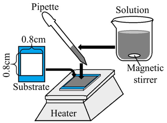 In this paper, Ni(OH)2 precursors are deposited by the drop–dry deposition (DDD) method and NiO thin films are fabricated by the annealing process. Figure 1 shows the schematic of DDD. DDD is a method of depositing a thin film by dropping and drying a solution on the substrate. DDD only uses a heating plate: the equipment required is simple and inexpensive. In addition, material efficiencies are high compared with other chemical techniques. Magnesium hydroxide and cobalt hydroxide have been successfully fabricated by DDD [43,44], but it has never been applied for nickel hydroxide. Owing to its simplicity and low cost, the fabrication of NiO thin films by DDD and annealing will be advantageous for various applications. In this work, we also fabricated ZnO/NiO heterojunction diodes using ECD-prepared ZnO. As shown below, rectification was confirmed, which indicates that DDD can be used in the fabrication of semiconductor devices based on NiO.
