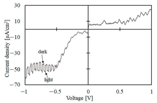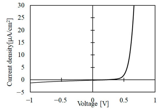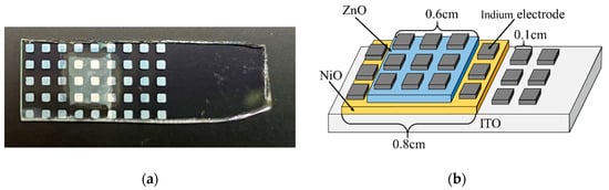 Figure 2 shows the schematic of the ZnO/NiO heterojunction. The ZnO/NiO heterojunction was fabricated by the following process. First, the NiO film with an area of 0.8 × 0.8 cm2 was fabricated on the ITO substrate by DDD and annealing. Then, a ZnO film was deposited on it by ECD. The deposition area of ZnO was limited to 0.6 × 0.6 cm2 by masking tape placed on the NiO film. The tape was removed after the deposition. The ZnO deposition solution contained 0.1 M zinc nitrate hexahydrate (Zn(NO3)2·6H2O, minimum 99% purity, Kanto Chemical Co. Inc., Tokyo, Japan) and was heated to 60 °C. The deposition time was 10 min, and the current density was −1.5 mA/cm2; the chemical reactions of the deposition are shown in ref. [46]. For the current-density–voltage (J-V) characterization, indium electrodes (0.1 × 0.1 cm2) were fabricated on the heterojunction by vacuum evaporation.