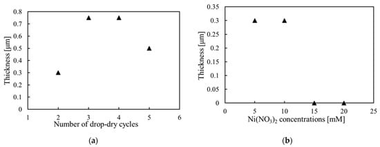Figure 4b shows the film thickness obtained with different Ni(NO3)2 concentrations (series (b)). With the increase in Ni(NO3)2 concentration (5–20 mM), the ratio of Ni(NO3)2 to NaOH increased from 1/2 to 2. The thicknesses of the samples obtained with 5 and 10 mM Ni(NO3)2 (the ratios of 1/2 and 1) were approximately 0.3 μm, but the surface was slightly rough for 10 mM Ni(NO3)2. The films were not successfully deposited with 15 and 20 mM Ni(NO3)2 (the ratios of 3/2 and 2), indicating that the Ni(NO3)2-to-NaOH ratio should not be higher than 3/2.
