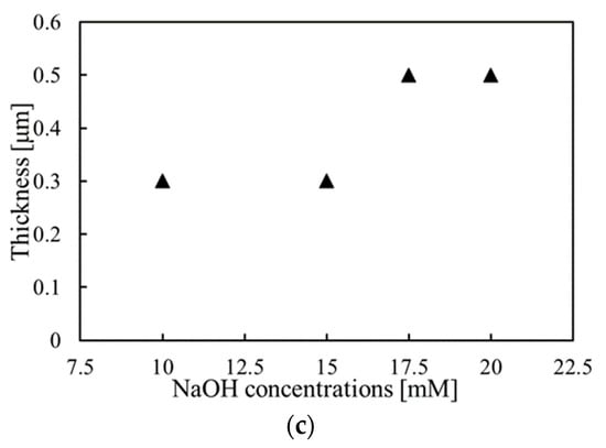 Figure 4c shows the film thickness obtained with different NaOH concentrations (series (c)). The thickness of the samples deposited with 10 and 15 mM NaOH (the Ni(NO3)2-to-NaOH ratio of 1 and 2/3) was approximately 0.3 μm. The sample thickness increased to 0.5 μm for 20 mM NaOH (the ratio of 1/2), but the sample surface became rough. This may be because aggregated Ni(OH)2 particles were formed in the solution and attached to the film surface. This indicates that the Ni(NO3)2 concentration ratio should be larger than 1/2.