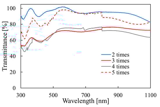 The transmittance results are shown in Figure 5 for different deposition cycle numbers. There is no absorption edge in the wavelength range in the figure. With the increase in the cycles from two to four, the film thickness increased from 0.3 to 0.75 μm as shown in Figure 4a, and the transmittance decreased from 90% to 70% in the visible region as shown in Figure 5. The thickness of the sample obtained with five cycles decreased as noted above, and the sample had a high transmittance (>90%) in the visible region. Thus, as the thickness increases, the surface roughness tends to increase and the transmittance tends to decrease. For the other deposition conditions (series (b) and (c)), the transmittance was in a range from 80 to 100%, and it tends to be larger for the thinner samples.
