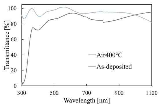 The transmittance measurement results before and after annealing are shown in Figure 6. Although the as-deposited Ni(OH)2 film has no absorption edge in the range of the figure, the annealed NiO film has an absorption edge of around 360 nm. Thus, the change from an insulator to a semi-conductor due to annealing was confirmed. Since NiO has a direct bandgap [1], the bandgap was calculated from the plot of (αhν)2 vs. hν, where α is the absorption coefficient and hν is the photon energy. The calculated bandgap is 3.4 eV, which is in the range reported in ref. [1].