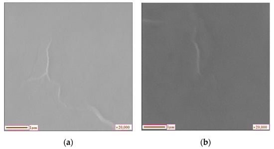 Figure 7 shows the SEM images of the thin film. Grain images were not observed on the surfaces, and the film morphology did not change significantly before and after annealing.