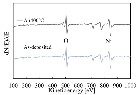 The AES measurement results are shown in Figure 8. Argon ion sputtering was performed for 10 s before the measurement. Only Ni and O were detected before and after annealing. Thus, the other elements in the deposition solution (Na, N) were mostly removed by the rinsing process. The composition ratios O/Ni of the thin film before and after annealing are 1.23 and 1.10, respectively; the oxygen content in the thin film decreased as the thin film changed from Ni(OH)2 to NiO. The argon ion sputtering before the measurement would result in the decomposition of the hydroxide. Thus, the O/Ni composition ratio before annealing was lower than that expected for Ni(OH)2. Similar results have been reported for cobalt hydroxide [44].