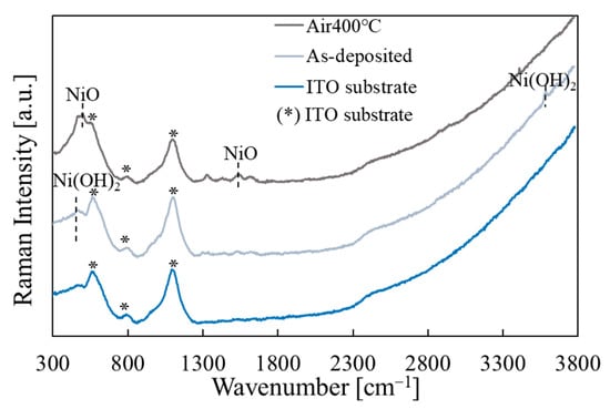 Figure 9 shows the Raman measurement results before and after annealing. The peaks of Ni(OH)2 and ITO (substrate) were observed before annealing [47], and the peaks of NiO and ITO (substrate) were observed after annealing [48]. Thus, it was found that the Ni(OH)2 precursor film was successfully fabricated by DDD, and the film was converted to NiO by annealing.