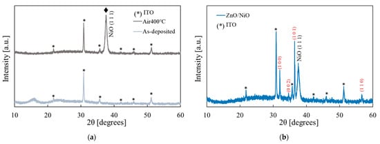The XRD results of the ZnO/NiO heterojunction is shown in Figure 10b. In addition to the peaks of NiO and ITO, the ZnO peaks were also observed (their indices are noted in red in the figure according to JCPDS 36-1451). Thus, the polycrystalline ZnO/NiO heterojunction was successfully prepared.