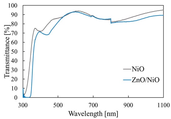 Figure 13 shows the transmittance of the ZnO/NiO heterojunction and that of the NiO single layer. ZnO has a smaller bandgap than that of NiO, and, thus, the absorption edge in the UV region was red-shifted compared with the spectrum for NiO. The absorption-edge energy of the heterojunction was 3.3 eV, consistent with the literature value for ZnO [46]. The transmittance was more than 70% in the visible range.
