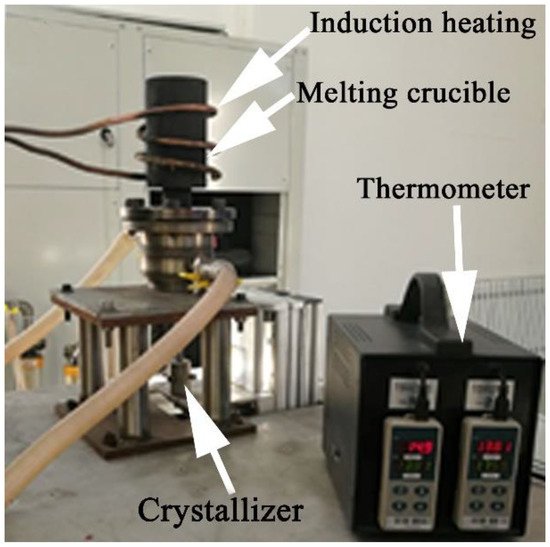 The ingot of a Cu-Ni-Si alloy containing 4.74 wt.% Ni, 1.19 wt.% Si, 0.096 wt.% Cr and the balance of Cu is prepared by HCCM continuous casting method [32] with melt temperature of 1300 °C, cooling water flow rate 600 L/h and casting speed 1 mm/s, as illustrated in Figure 1. The ingot is then solution treated at 1000 °C for 1 h to obtain a homogenized supersaturated solid solution. The ingot is directly deformed into plates by cold rolling of 90% reduction. A two-step aging process is conducted herein for the further improvement in the precipitation process (i.e., first step of aging treatment at 500 °C, followed by 70% cold rolling and second step of aging treatment for different time at 450 °C).