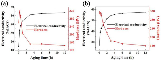 The variation of hardness and electrical conductivity with increasing aging time, (a) the first step (500 °C) and (b) the second step (450 °C) of aging treatment.