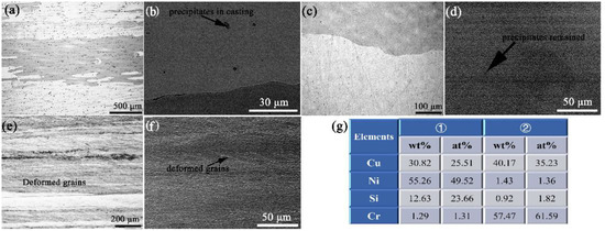 The evolution of microstructures of the Cu-Ni-Si alloy during the fabrication process, containing SEM photographs of (a) HCCM casting, (b) the magnified casting microstructure, (c) solution treated, (d) the magnified solution treated microstructure, (e) cold rolling, (f) magnified cold rolling microstructure, and (g) the EDS data of the position marked in (a,b).