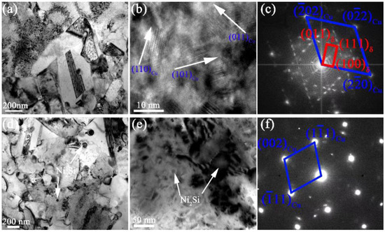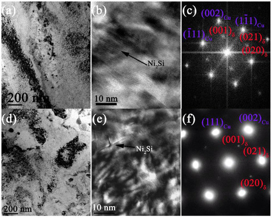 It is found that many refined δ-Ni2Si precipitates are formed in the early stage of aging process, as shown in Figure 6a,b, with the size of only about 10 nm. It shall be noticed that, a OR between precipitates and matrix of (110)Cu//(100)δ, [111]Cu//[011]δ. It can also be seen in Figure 6b that, precipitates along the three crystal planes of <110>, i.e., [110], [101] and [011] planes of Cu matrix, are observed in the alloy as marked by the white arrow in Figure 6b, which is in good accordance with the SADP in Figure 6c. The size of these precipitates is found increasing with the prolonging aging time. For instance, the size of δ-Ni2Si precipitates are increased to more than 1 μm (as seen in Figure 6d), resulting in the loss of OR between precipitates and matrix, as shown in Figure 6e,f.