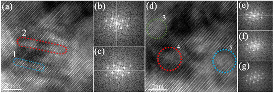 The high resolution TEM photographs of the refined Ni2Si precipitates in the Cu-Ni-Si alloy during the second step of aging at 450 °C for (a) 0.25 h, with (b,c) the corresponding SADP obtained by FFT transition of position 1 and 2, respectively, and (d) for 0.5 h with (e–g) the corresponding SADP obtained by FFT transition of position 3, 4 and 5, respectively.
