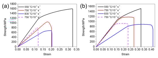 Stress–strain curves for SL (a) and SH (b) between 550 °C and 830 °C under different strain rates.