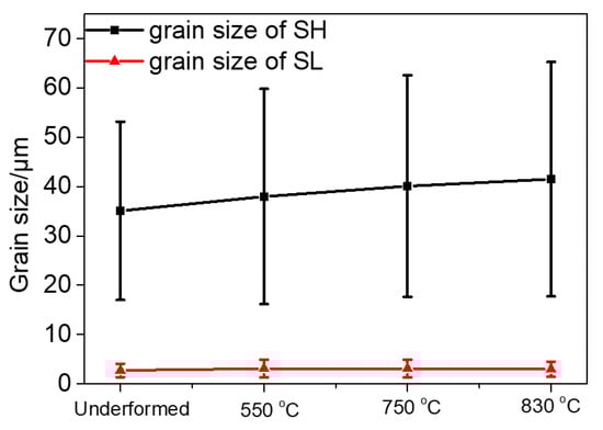 The mean grain sizes of the undeformed and deformed samples were statistically measured by EBSD and are presented in Figure 12. The grain size of SH is influenced significantly by deformation and the deformation temperature compared to that of SL. The average grain size of the undeformed SH sample was measured to be 35.07 μm, which was the lowest among the four SH samples. With an increase in the deformation temperature, the grain size became higher and reached 41.51 μm after deformation at 830 °C. Compared to SH, the average grain sizes for SL did not vary greatly through deformation.