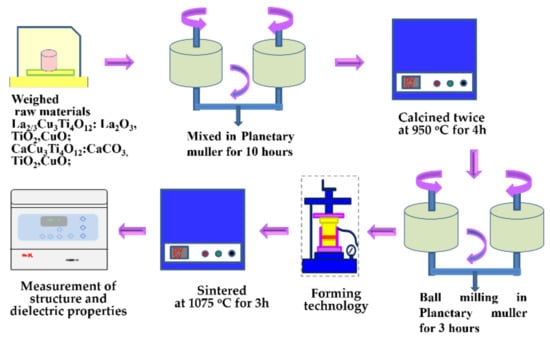 La2/3Cu3Ti4O12 were prepared by the solid-state reaction process (as shown in Figure 1) from the high-purity powders of TiO2 (99.99%, Aladdin Reagent Co., Ltd., Shanghai, China), CuO (99.9%, Aladdin Reagent Co., Ltd.), and La2O3 (99.99%, Aladdin Reagent Co., Ltd.). Raw materials were weighed and mixed in a planetary muller for 10 h, were heated twice at 950 °C for 4 h, and then pressed into disks (diameter: 12 mm). The disks were sintered from 1050 °C to 1125 °C in the air for 3 h to find their highest density. The ceramics sintered at 1075 °C with the highest theoretical density (98.6%) were analyzed in further investigations. CaCu3Ti4O12 ceramics for comparison were prepared by the same experimental process.