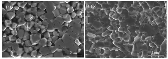 SEM pictures of the cross-section for CaCu3Ti4O12 (a) and La2/3Cu3Ti4O12 (b) ceramics.