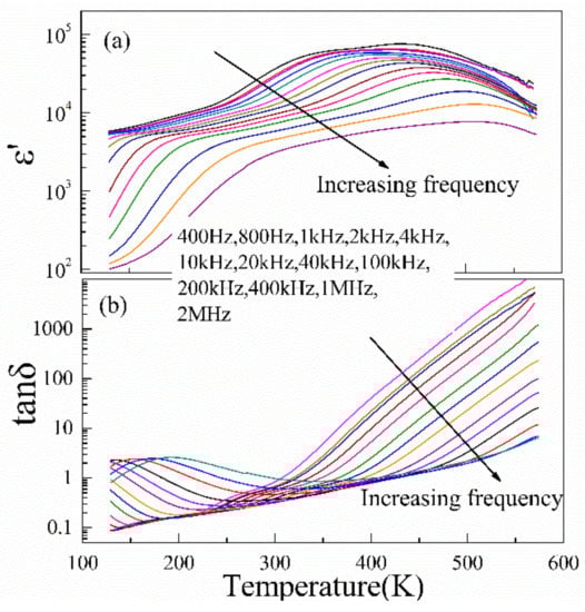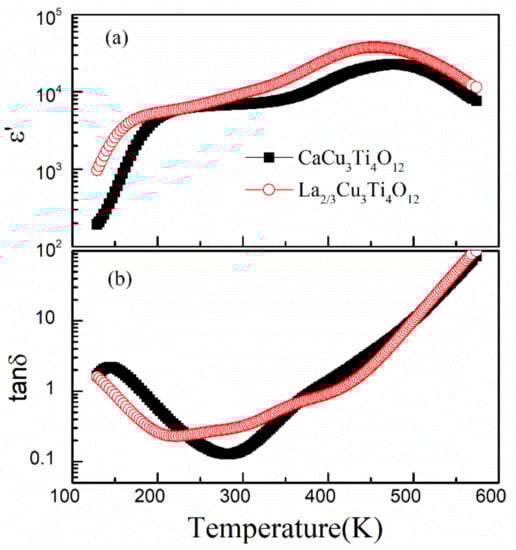 The temperature dependence of dielectric properties for La2/3Cu3Ti4O12 ceramics is represented in Figure 4. Dielectric properties of La2/3Cu3Ti4O12 and CaCu3Ti4O12 ceramics at room temperature and different frequencies are listed in Table 2. The total substitution of La3+ for Ca2+ ions in CaCu3Ti4O12 ceramics has greatly increased the room temperature dielectric constant. Two dielectric relaxations are observed at two different temperature ranges (low-T: 123–200 K; high-T range 300–550 K), which is similar to those observed in CaCu3Ti4O12 ceramics. The dielectric constant ε′ decreases suddenly when the samples are cooled to a critically low temperature and the dielectric constant plateaus reduce slightly with increasing the frequency, while the dielectric peaks (about 6 × 104) at high temperatures significantly decrease with increasing frequency. The low-T and high-T dielectric relaxations both show obvious frequency dispersion. Two parts of dielectric loss peaks are observed at the corresponding critical temperatures. However, two dielectric relaxations in La2/3Cu3Ti4O12 ceramics both move to a lower temperature (as shown in Figure 5).