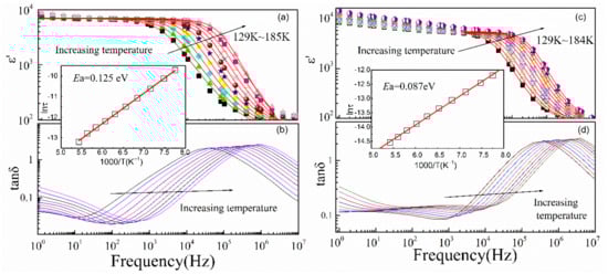 Frequency dependence of dielectric properties of CaCu3Ti4O12 (a,b) and La2/3Cu3Ti4O12 (c,d) ceramics, respectively, in a low-temperature range (129–184 K). In figures (a,c), the experimental data are represented by the solid symbols, and the fitting results by the modified Debye’s model are the lines. Insets show the temperature dependence of the relaxation time τ.