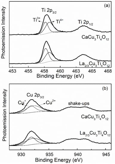 XPS of the Ti (a) and Cu (b) ions of La2/3Cu3Ti4O12 and CaCu3Ti4O12 ceramics, indicating the polyvalence Ti3+/Ti4+ and Cu+/Cu2+.