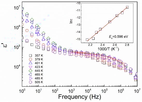 Frequency dependence of high-T dielectric constant in La2/3Cu3Ti4O12 ceramics from 357 K to 505 K. Experimental data are represented by solid symbols which are linearly fitted by Equation (1). Inset represents the linear dependence of the relaxation time τ vs. temperature.