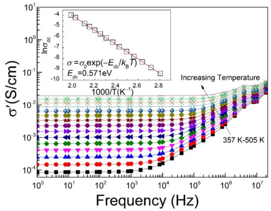 Figure 9 represents the frequency dependence of ac conductivity of La2/3Cu3Ti4O12 ceramics in a high-temperature range from 357 to 505 K. The extrapolated dc conductivity at a low frequency well obeys the Arrhenius relation [18] as a function of temperature (as shown in the inset of Figure 9). The calculated activation energy of conductivity (Edc = 0.571 eV) is similar to the previously reported value for La2/3Cu3Ti4O12 ceramics [26,27,28], and is close to that of high-T dielectric relaxation (Erelax = 0.596 eV) and also implies the correlation between dielectric relaxation and conduction at high temperature.