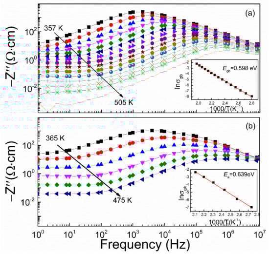 Frequency dependence of Z″ for La2/3Cu3Ti4O12 (a) and CaCu3Ti4O12 (b) in the high-T range. Solid symbols in insets are experimental data representing the temperature dependence of grain boundary conductivity σgb, and the fitting results are shown as red lines.