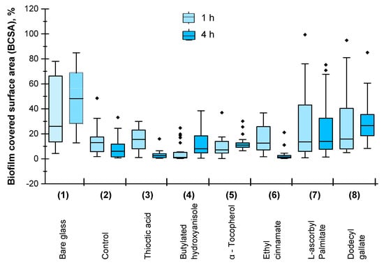 Confluent biofilm does not form on any coated surface or bare glass (BSCA is below 100% in all cases) and the effect of the different antioxidants on M. hydrocarbonoclasticus biofilm development is specific, as is evident in Figure 2. Compared to the bare glass (Figure 2, Sample 1), all coated surfaces (Figure 2, Samples 2–8) reduced BCSA after 1 h (the light blue bars) and 4 h growth (the dark blue bars) indicating some anti-biofilm activity of all coatings, including that without antioxidants (Figure 2, Sample 2). This is not a surprise as the basic coating composition forms low adhesive fouling release coatings, and the addition of antioxidant aims at improving the performance of this type of coating. The effect of antioxidant-containing coatings (Figure 2, Samples 3–8) on the BCSA is quite different, as compared to the control coating without antioxidants (Figure 2, Sample 2):