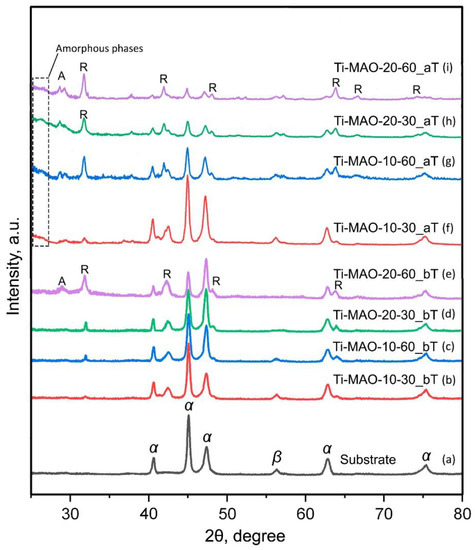 It can be seen that, in the base, manufactured by the EBM method using the additive technology from the powder of the titanium (α + β) alloy Ti-6Al-4V, there are α-Ti and β-Ti phases. After MAO treatment in Ti-MAO-10-30, Ti-MAO-10-60, and Ti-MAO-20-30 coatings, X-ray phase analysis identifies titanium dioxide only in the TiO2-rutile modification. This is explained by the fact that another modification of titanium dioxide, TiO2-anatase, when heated to 620–650 °C, turns into rutile, which is denser and harder. Such heating is provided by the plasma of microdischarges migrating over the treated surface. In addition to rutile, anatase is present in the Ti-MAO-20-60 coating with a thickness of more than 60 μm, which may indicate the “immersion” of the high-temperature discharge region deep into the pore channels of MAO coating, and insufficient heating of its surface layer. After thermal cycling tests, the X-ray diffraction patterns of all coatings show the TiO2-anatase phase, which can be explained by the thermal oxidation of titanium when the substrate is heated and air penetrates to it through pores in the MAO coating. It is known [46] that during aging, titanium dioxide obtained from an alkaline medium (the pH of the silicate-hypophosphite electrolyte is significantly more than 7) partially becomes X-ray amorphous. In addition, the absence of peaks of SiO2 (α-cristobalite and α-quartz) at large amount of silicon in the surface layer of MAO coatings (Table 4), as well as titanosilicate and aluminosilicate peaks on the diffractograms, indicate that they are in an amorphous state. The amorphization of the oxide layer is indicated by the presence of a “halo” in diffraction patterns (Figure 5f–i) at small angles of 2θ (less than 30 degrees).